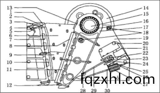 1-前機架(jia);2-上楔(xie)塊;3-填充楔(xie)塊(kuai);4-挿頭螺(luo)栓(shuan);5-盤(pan)式(shi)彈(dan)簧(huang)罩;6-頰(jia)闆(ban)(上(shang));7-固(gu)定顎闆(上);8-活(huo)動顎闆(ban)(上(shang));9-頰(jia)闆(ban)(下);10-固(gu)定(ding)顎(e)闆(下);11-活動顎闆(ban)(下(xia));12-固(gu)定(ding)楔(xie)塊;13-動(dong)顎(e)體孔眼防(fang)護(hu)闆;14-飛輪(lun);15-偏(pian)心軸(zhou);16-動顎體(ti)軸承(cheng);17-動(dong)顎體(ti);18-機(ji)架連(lian)接(jie)桿(gan);19-側(ce)闆;20-機架螺(luo)栓(shuan);21-后(hou)機架(jia);22-調節楔塊(kuai);23-墊(dian)片;24-肋闆座(zuo)闆;25、28-肋(le)闆(ban)座;26-帶止(zhi)推套(tao)的(de)鎖(suo)緊(jin)螺母;27-拉(la)力(li)彈簧(huang);29-肋闆;30-張力(li)桿(gan)